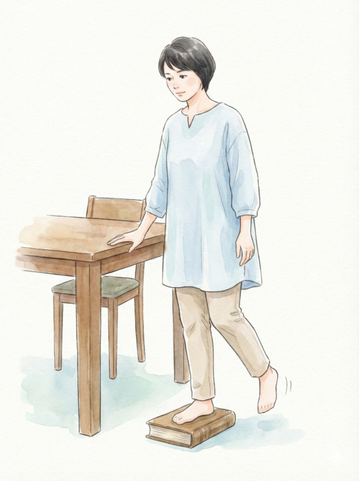 準備: 3~5センチ程度の厚みの本などを、股関節に痛みのある(もしくは足が短く感じる)片足の下に置きます。片足が本に乗った状態で、そのまま足踏みをします。