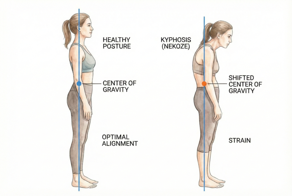 人の体には、楽に動ける「重心の定位置」があります。 しかし、股関節に痛みがある方の多くは、痛みをかばうあまり「猫背」になり、重心が「かかと寄り(後ろ側)」に崩れてしまっています。