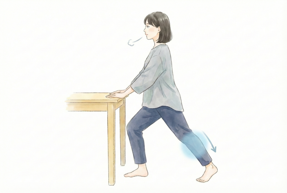 最初の目安としては、左右それぞれ20〜30回程度です。膝を曲げるときに「ふぅー」と息を吐きながら行うと、余分な力が抜けやすくなります。。痛みや不安が出る場合は、回数を減らしたり、中止したりしてかまいません。