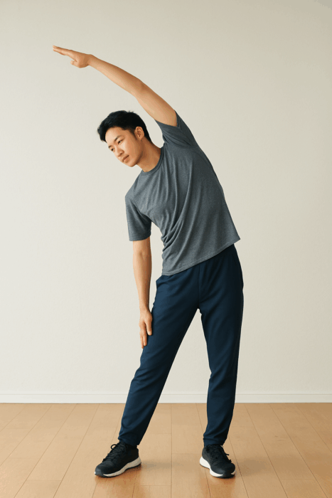 - 椅子に座る(もしくは立った状態)で腰を反らさず、手を挙げて上半身をゆっくり左右に倒す