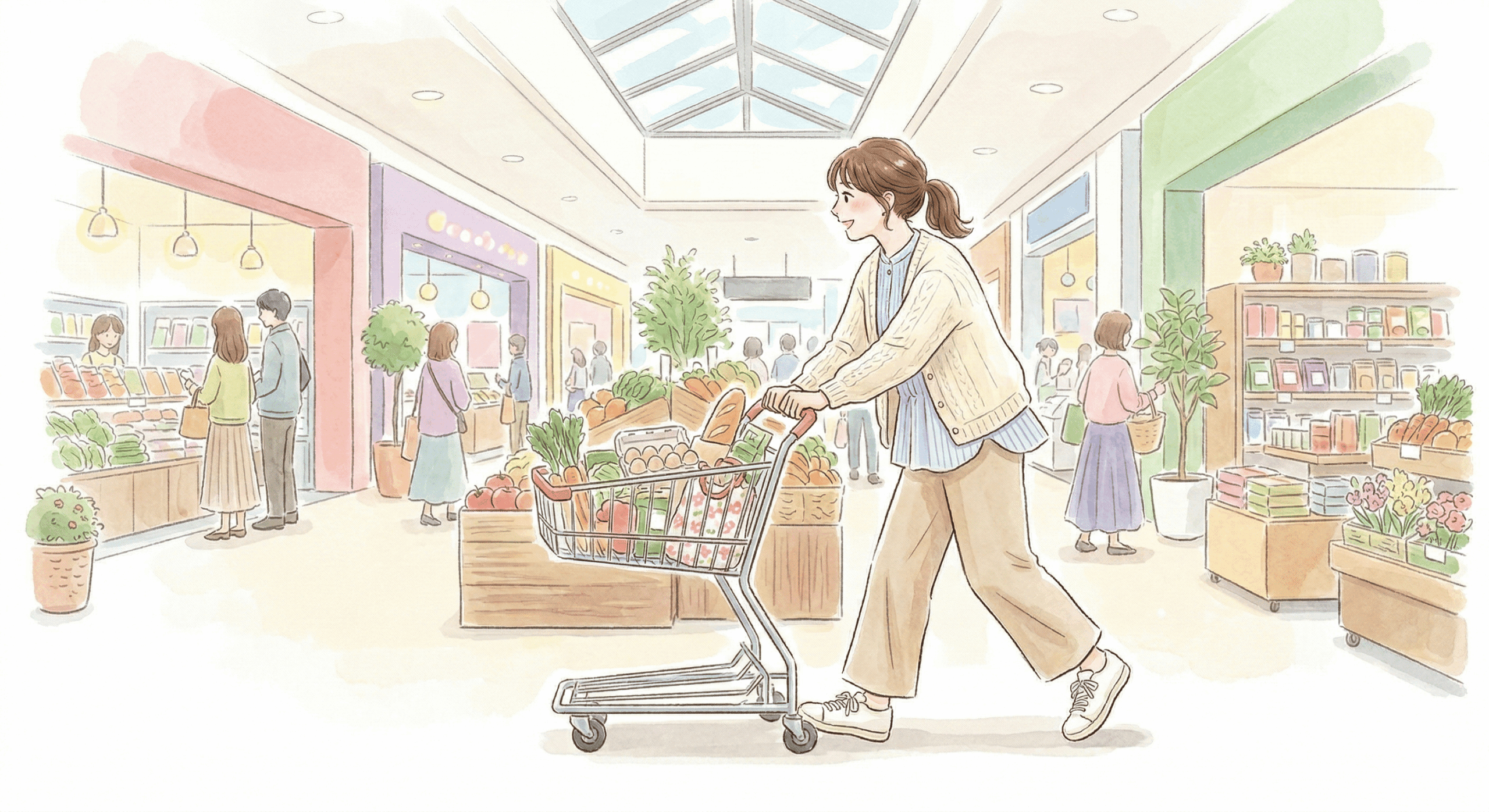 広い郊外型のモールで股関節が痛む方へ。理学療法士が教える「疲れないカートの押し方・歩き方」