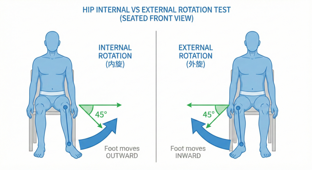 - 比較: 左右の足で、外・内のどちらが動きにくいかを確認します。